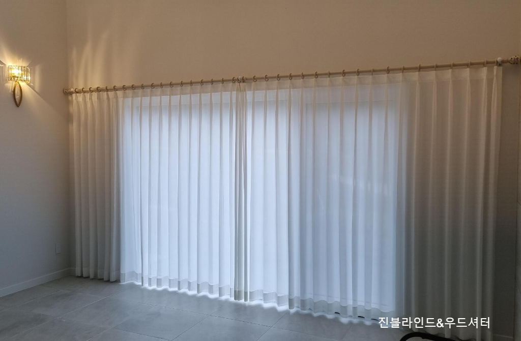 챠르르한 도톰쉬폰으로 전원주택 거실에 잘 어울리는 커튼입니다.