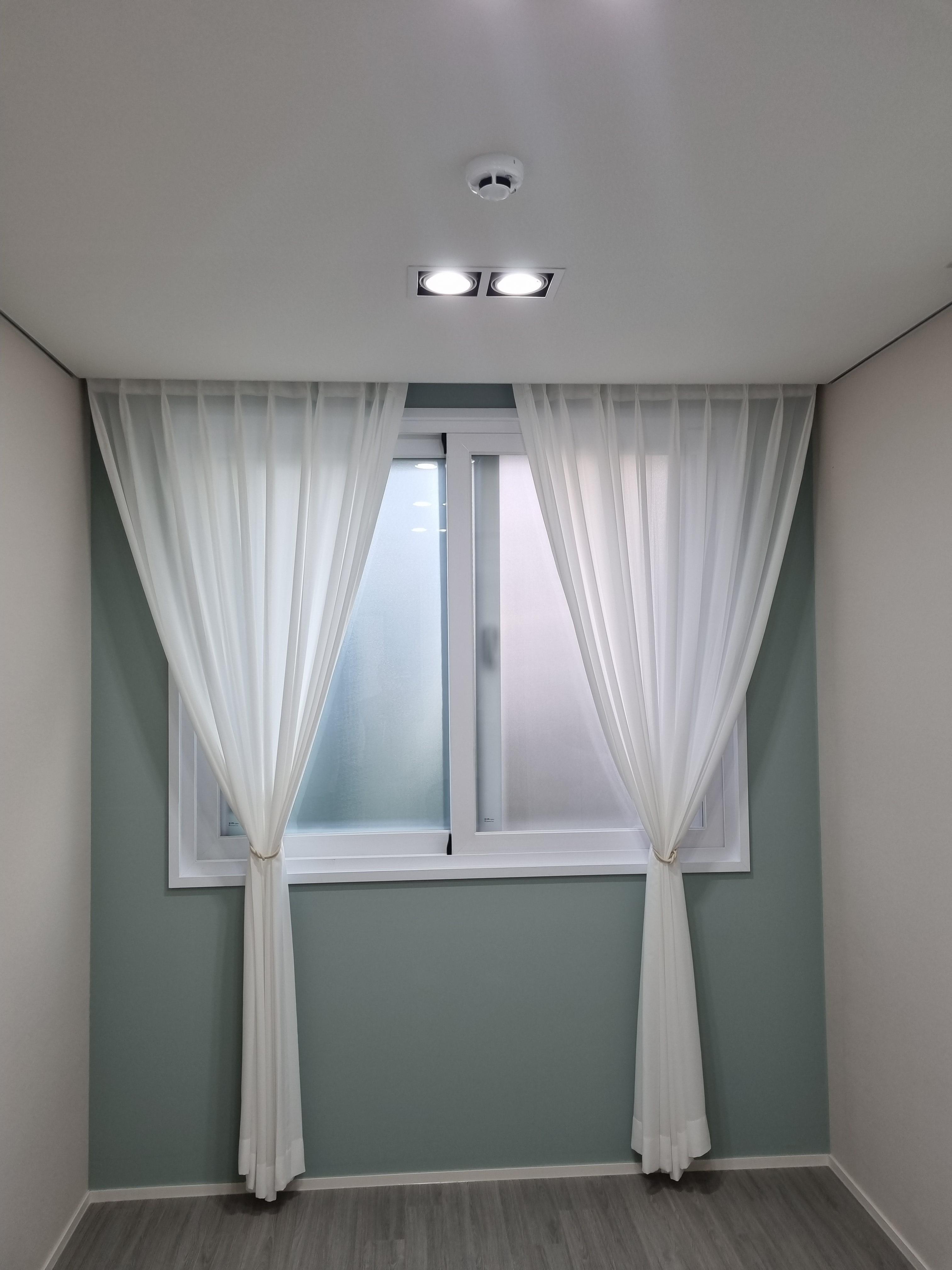 허니콤블라인드 옆쪽으로 화이트도톰헤비쉬폰커튼입니다.