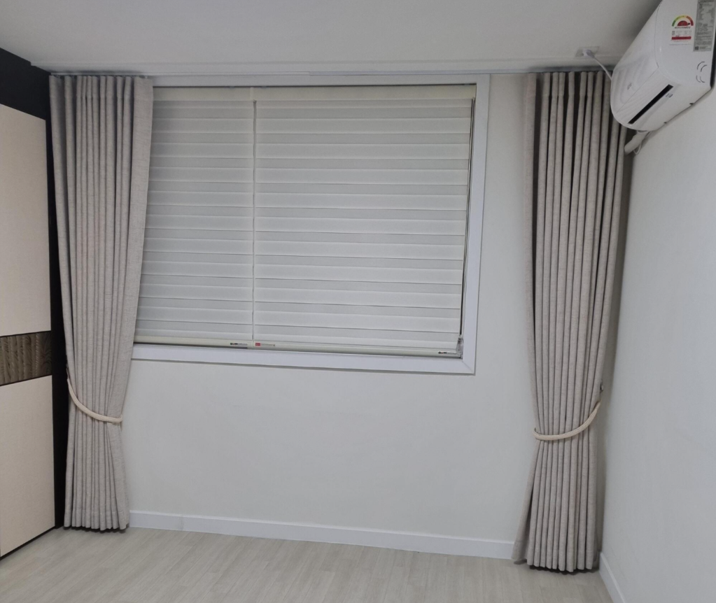 외풍차단 효과 만점인 겹가공 암막커튼으로 마무리 하였습니다.