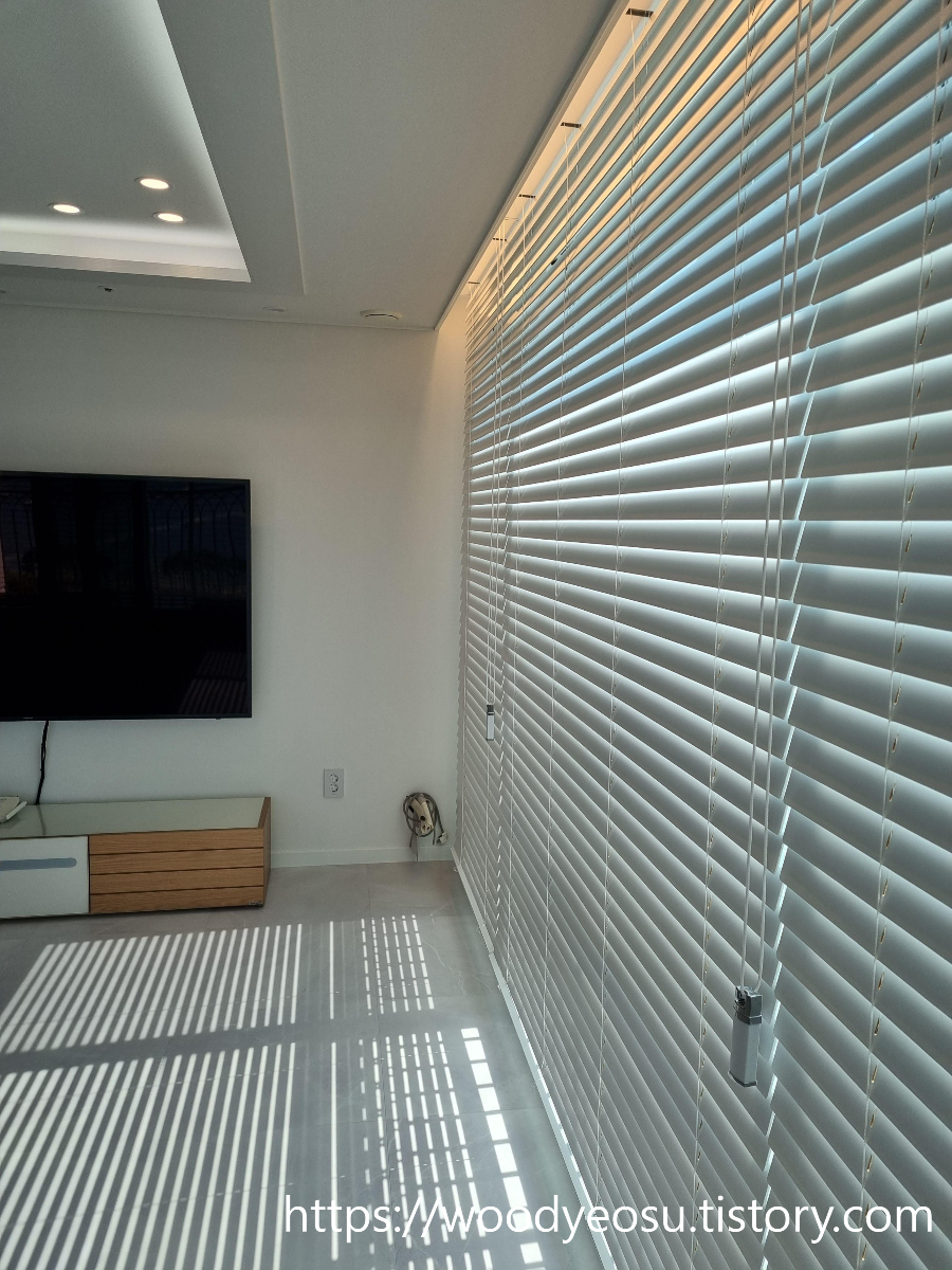 여수웅천지웰아파트 거실에 설치한 우드블라인드입니다.