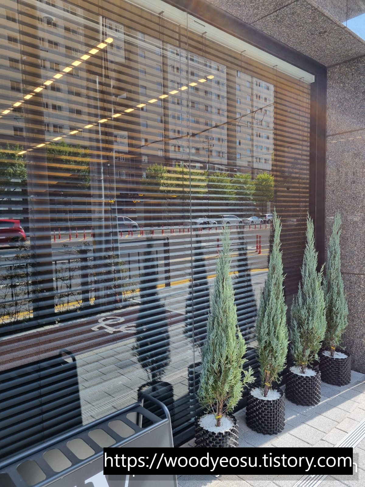 더블유닷 카페 앞쪽에 있는 율마와 함께 블라인드 사진 남겨봅니다.