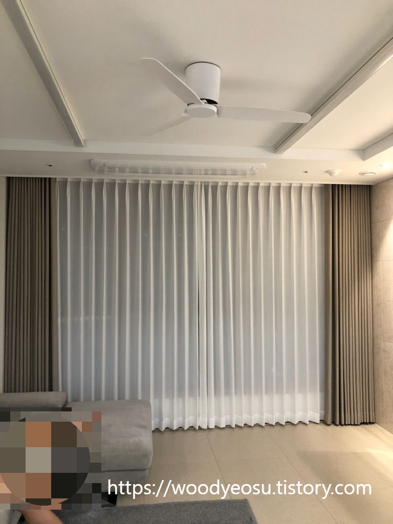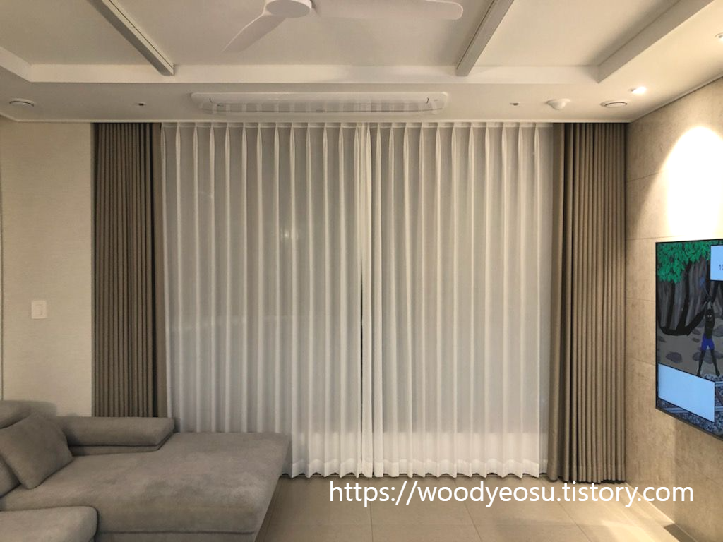 햇빛이 강한 앞쪽거실은 속커튼과 겉커튼을 설치했고