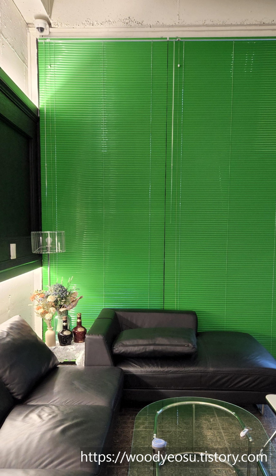 기존의 커튼 제거후 녹색의 알류미늄블라인드 설치한