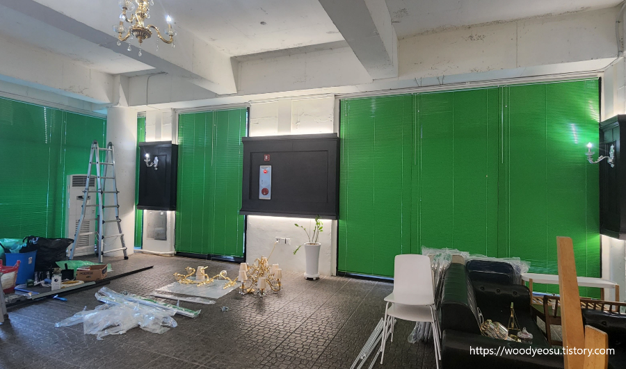 기존의 커튼 제거후 녹색의 알류미늄블라인드 설치한