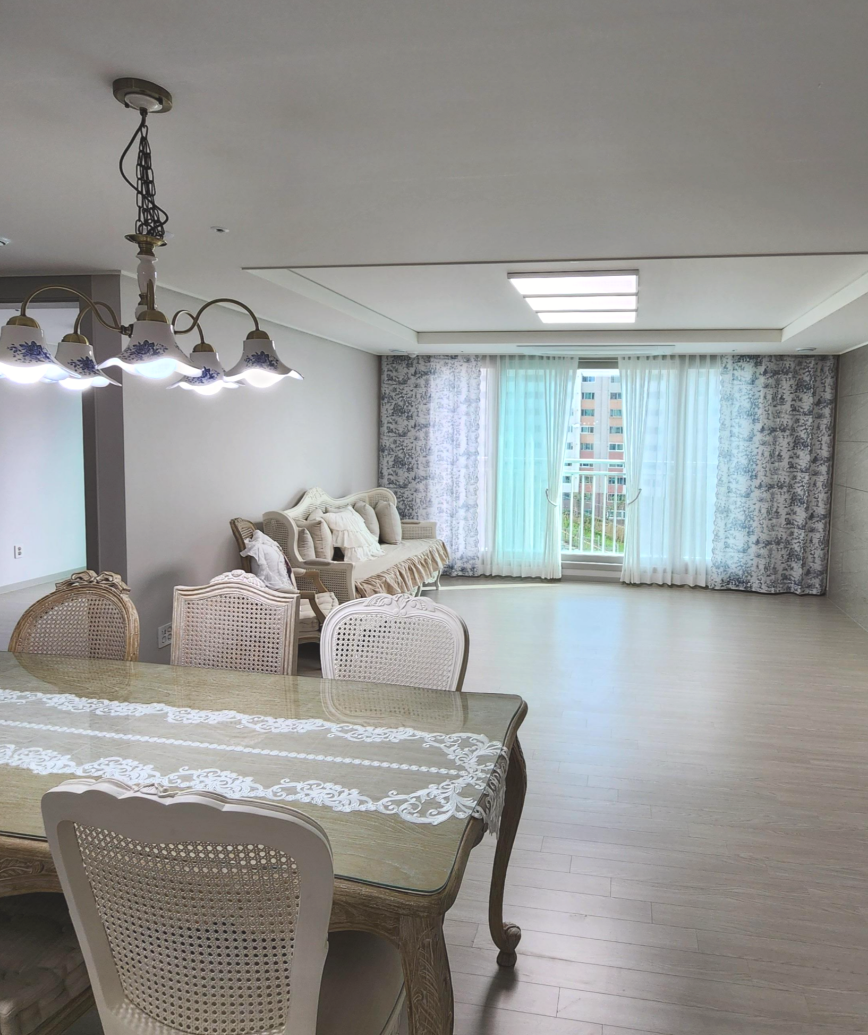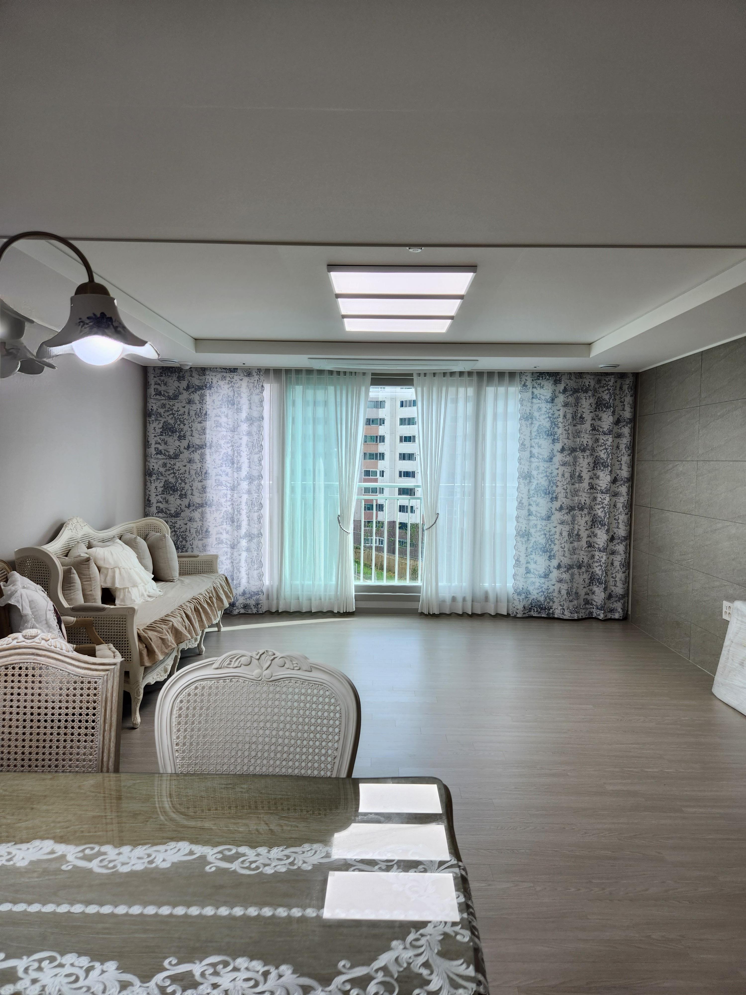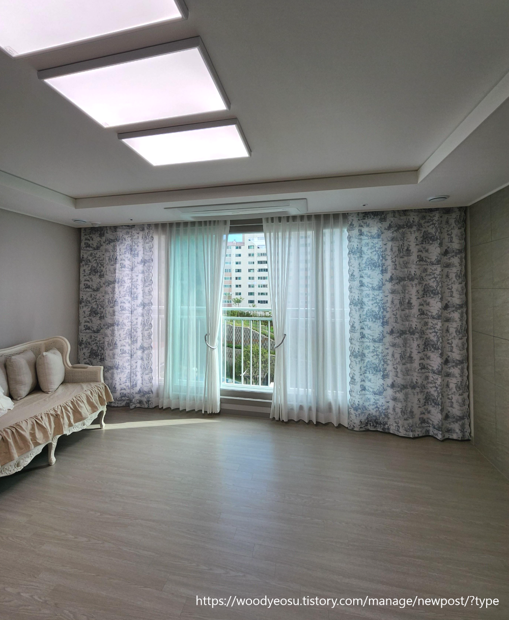엔틱한 거실쇼파와 명화나염포인트 커튼이 참 잘어울립니다.