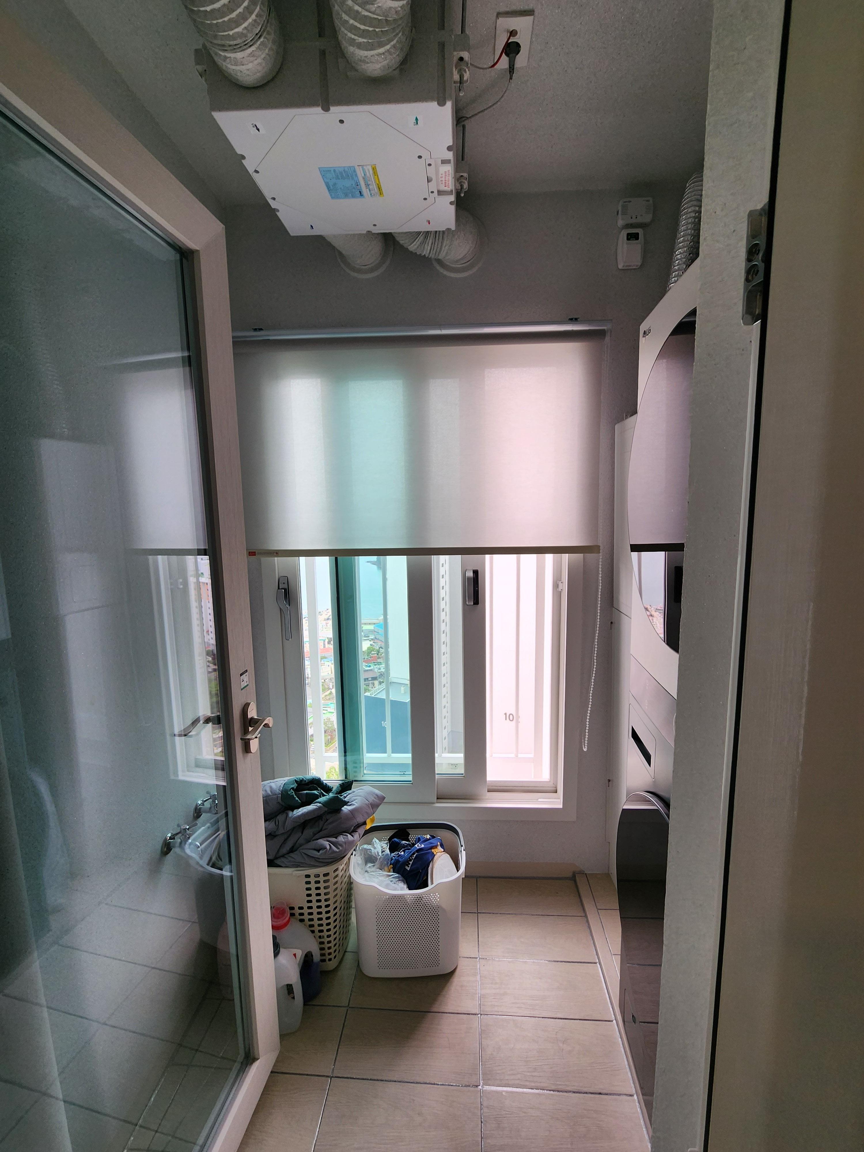 세탁기 놓는 베란다에는 롤스크린 설치한 실제시공사진입니다.