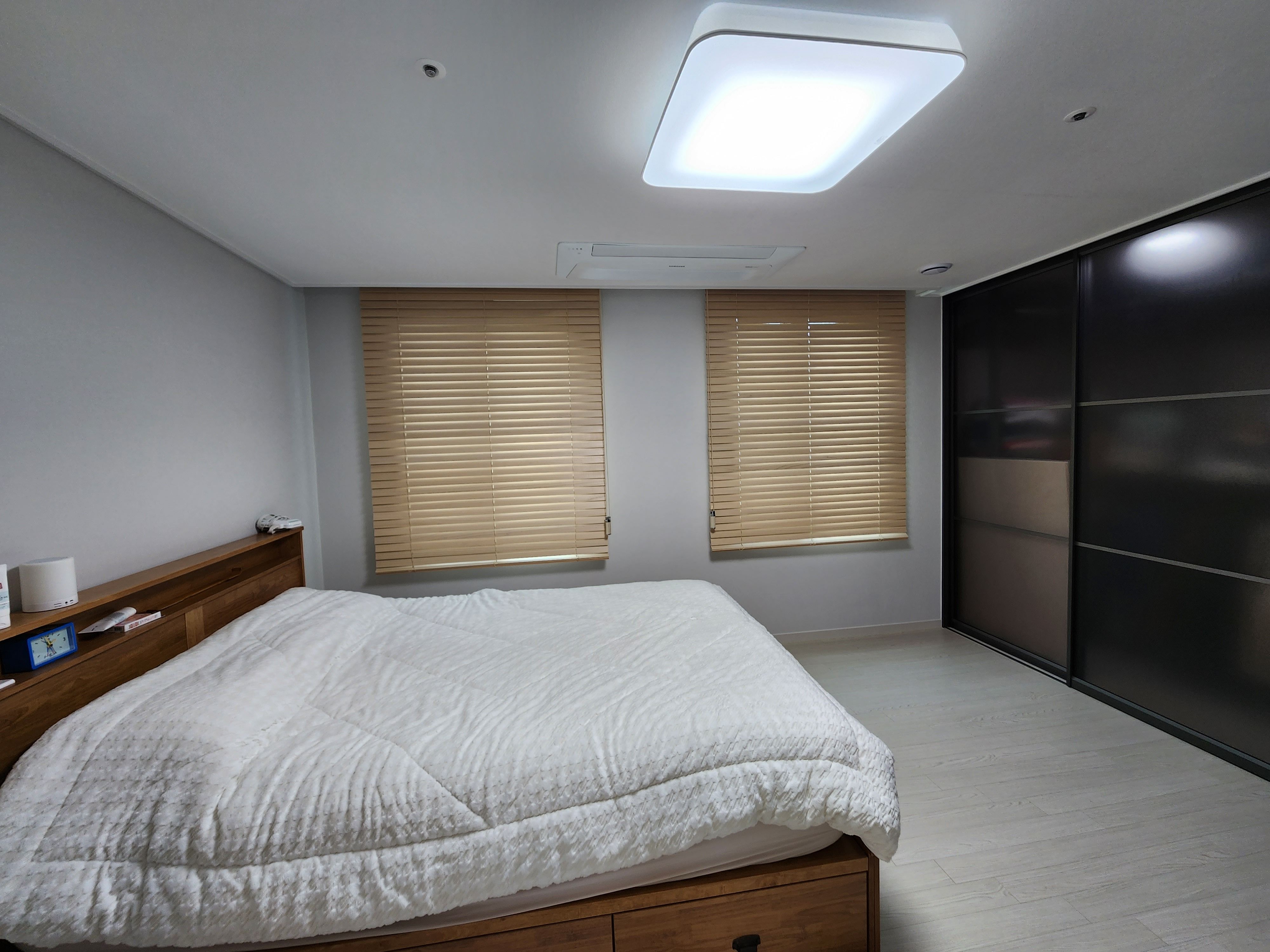 침실에 설치한 천연오동나무 우드블라인드입니다.