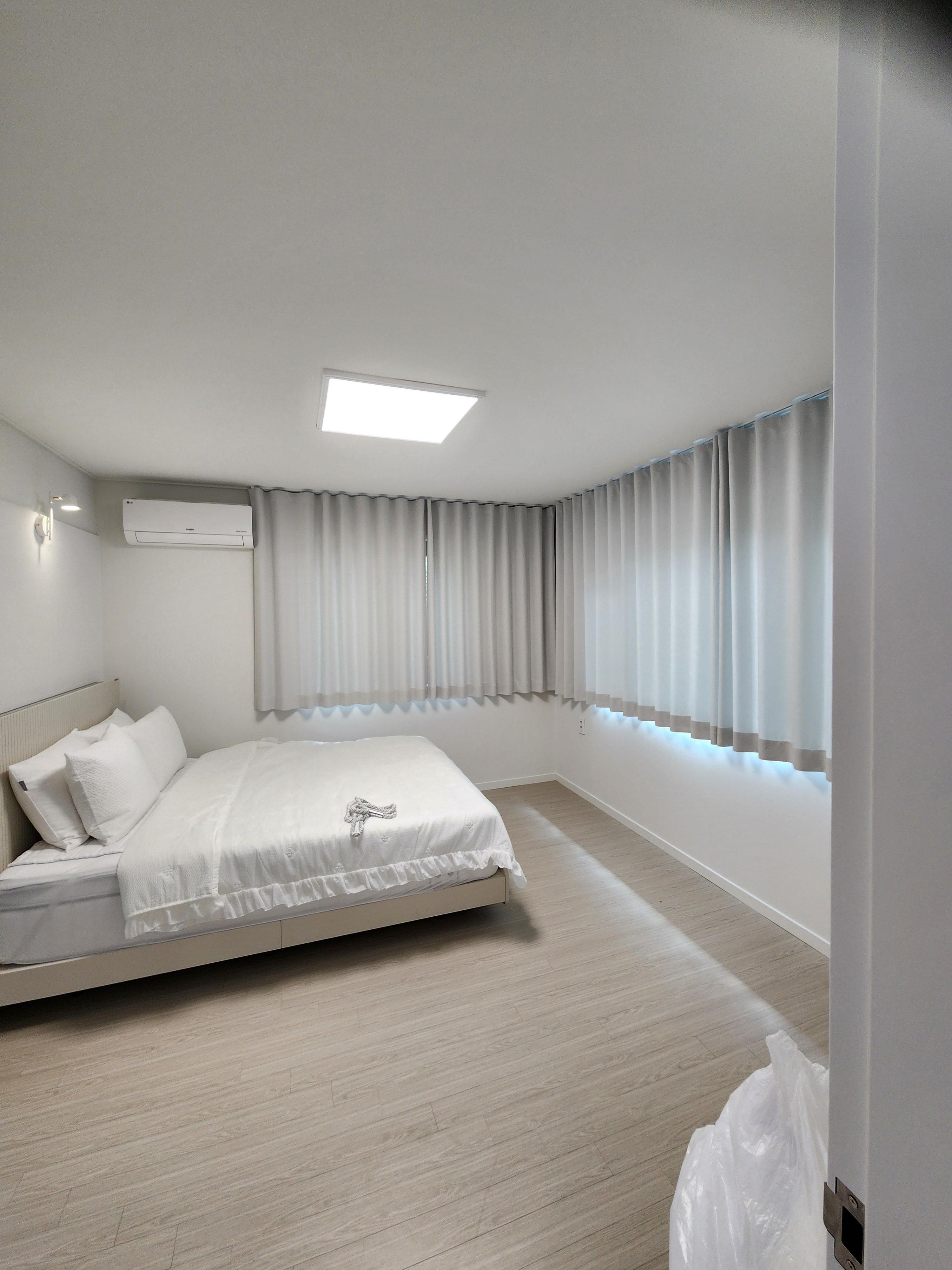 침실에도 깔끔하게 세미암막커튼 설치해 드렸습니다.