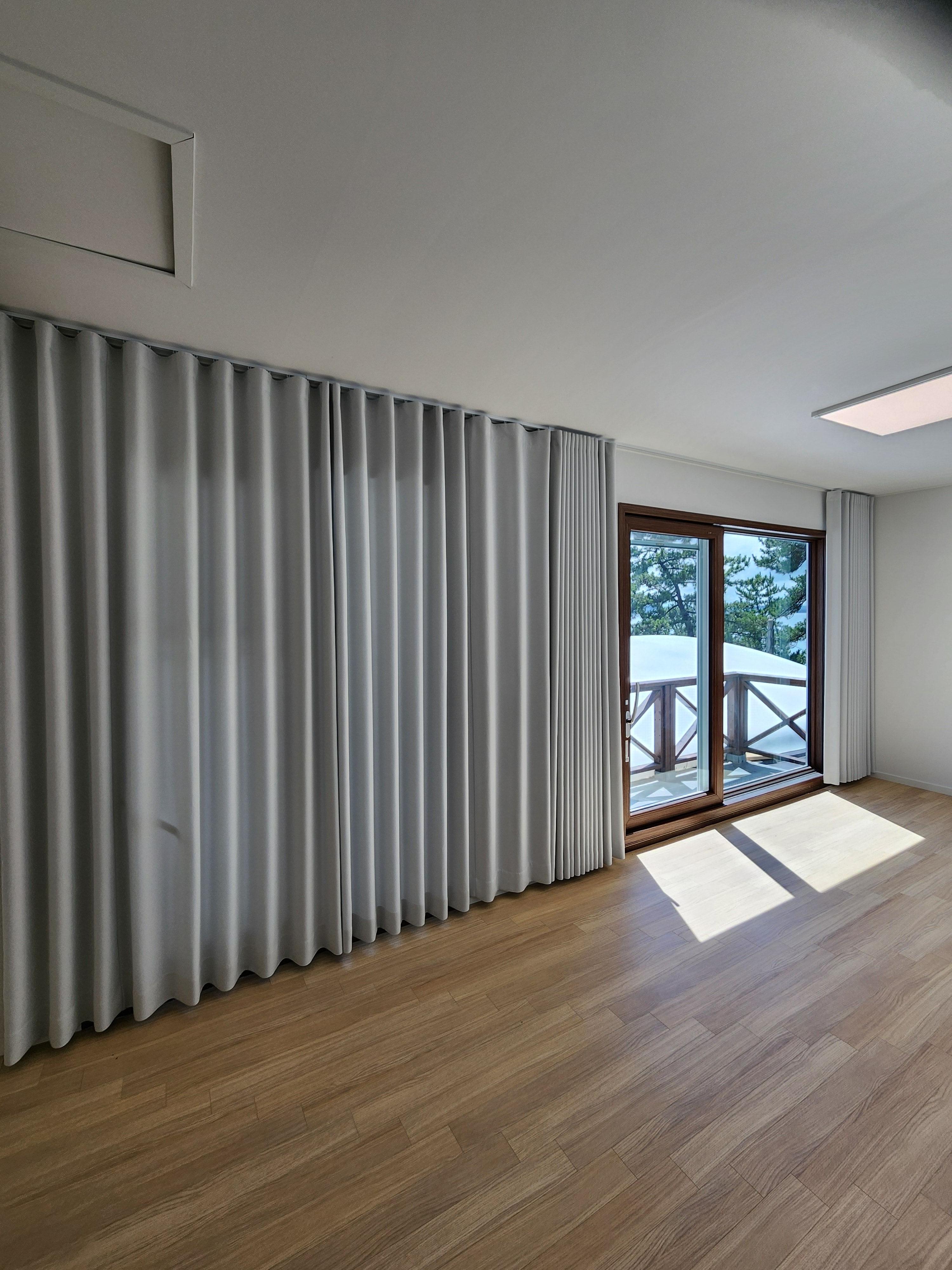 세미암막커튼 1.5배 정도의 형상가공주름으로 자연스럽게 열어놓은 커튼입니다.