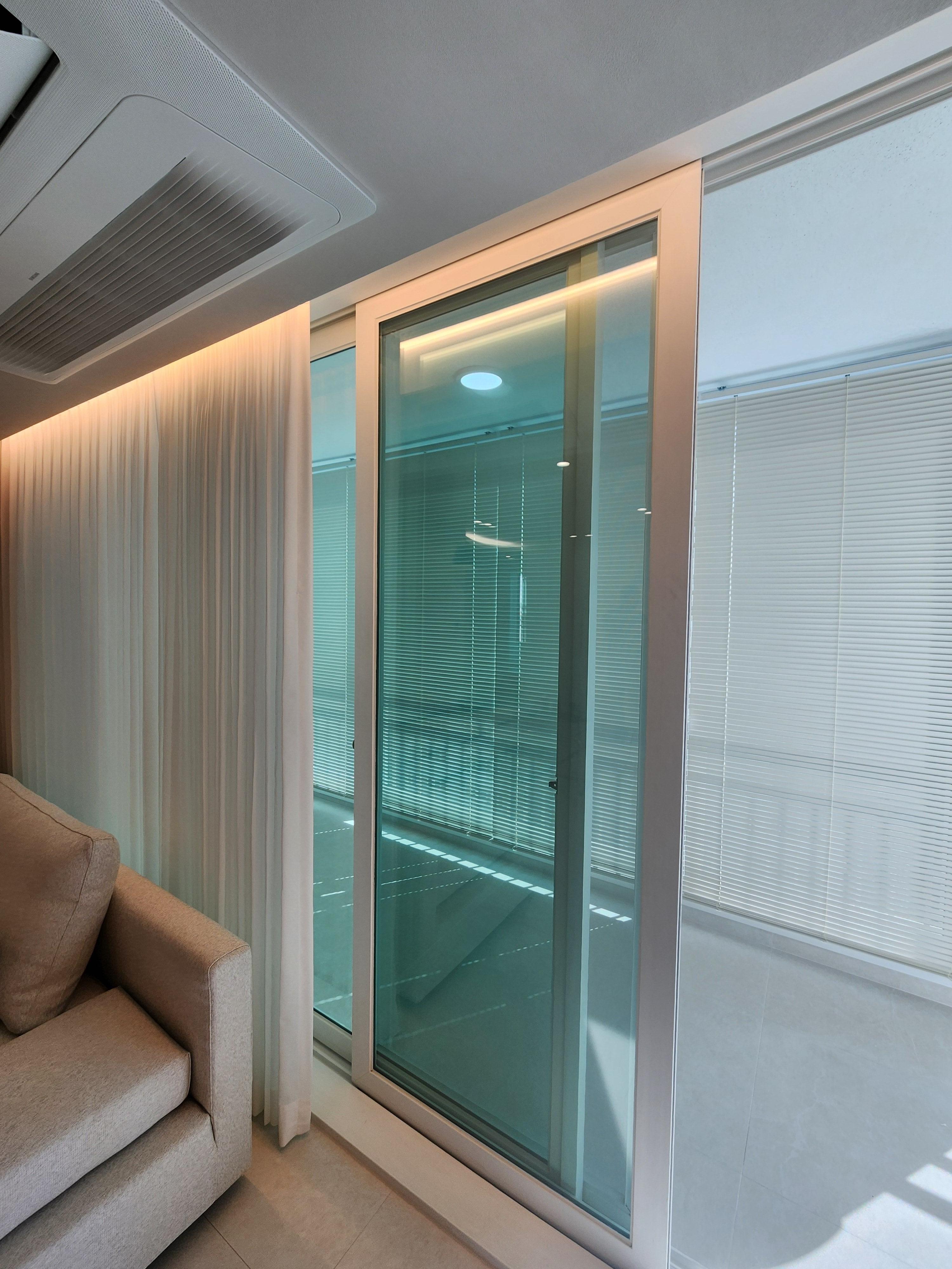 거실베란다에는 알류미늄블라인드(베네시안블라인드) 원코드형으로 깔끔하게 설치해 드렸습니다.