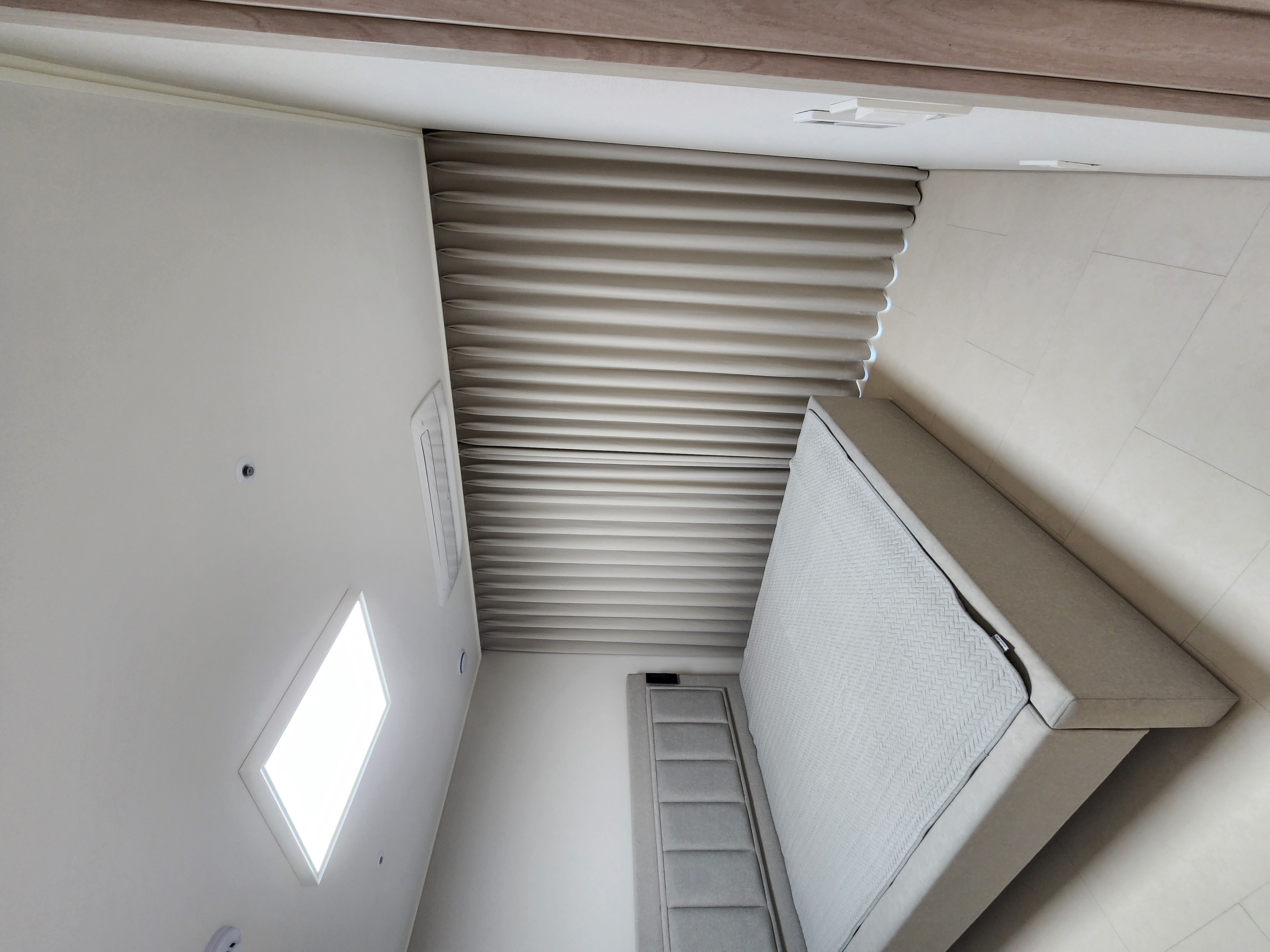 여름에 강한 햇빛을 고려하여 겉커튼은 실생활암막커튼으로 제작시공해 드렸습니다.